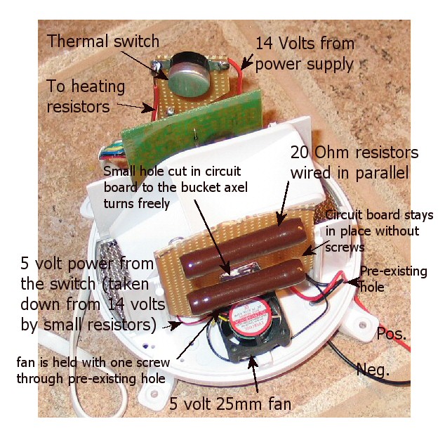 I got two 20 Ohm heating resistors off the net and a 25mm fan to circulate the air. I did this so the heating would be more distributed and so the resistors wouldn’t melt the rain gauge plastic, although I don’t think this is too likely. I also got a thermal switch off the net. The switch turns on the resistors and fan at 1 degree C and switches off at 10 degrees C.