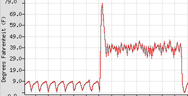 The construction is pretty self explanatory. With the 20 Ohm resistors in parallel, the design cranks out about 20 watts of power. That's plenty. The unit stays consistantly above freezing. I tested it in my deep freeze with a remote temp sensor in the funnel. Here's the result: (that inital spike is from opening the fridge to put the unit in and handling the temp sensor, ignore it.)